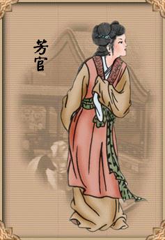 原姓花,姑苏人氏,贾家买来唱戏扮正旦的。戏班解散后成了宝玉的丫环。有一次蕊官送她一些蔷薇硝,贾环见了也要,她不舍得,就把茉莉粉给了他。赵姨娘得知后,气冲冲地跑来打芳官,藕官、蕊官、葵官、豆官听见后便一齐来帮芳官。芳官聪明伶俐,王夫人却诬其为狐狸精,成天调唆宝玉而把她撵了出去,赏她乾娘给她外头找个女婿。芳官不甘心再被乾娘欺负买卖,便跟水月庵的智通出家去了。