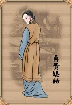 吴贵是晴雯的姑舅哥哥,老实胆小,人都叫他贵儿。吴贵媳妇人伶俐,又兼有几分姿色,看著贵儿无能,便每日打扮得十分妖娆,两只眼儿水汪汪的,招惹得赖大家人如蝇逐臭,渐渐地做出些风流勾当来。贵儿两口子住在大观园的后角门外,伺候园中买办杂差。晴雯被撵出大观园,住在吴贵家,宝玉前去探望,那媳妇又百般缠磨宝玉,把宝玉吓得怔住了,晴雯气得昏晕过去。晴雯死后,他们催人立刻入敛,抬往城外化人厂去了。那媳妇听说晴雯死后作了花神,每日晚间便不敢出门。有一天,吴贵出门回来晚了,那媳妇本有些感冒,日间吃错了药,死在炕上了。
