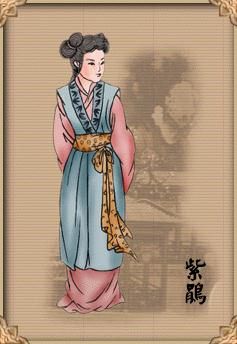 原名鹦哥,是贾母房里的二等小丫头。贾母见林黛玉来时只带了两个人,惟恐不中使,便把鹦哥给了黛玉,改名为紫鹃。她和黛玉关系很好,情同姐妹,一时一刻离不开。她见黛玉是个孤儿,又和宝玉真心相爱,就劝黛玉趁老太太还硬朗的时候作定大事要紧。为此,她想出林家要接黛玉回苏州的话来试宝玉,使宝玉痴病大发。黛玉死后,她被派到宝玉屋里做丫头,后跟贾惜春出家终身服侍惜春。