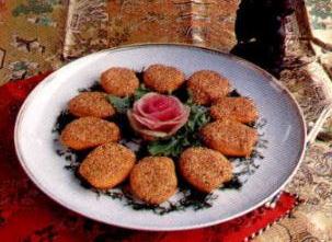 2、将鸡蛋除去蛋黄,留蛋清放在盆中用蛋抽将其抽起,加入适量面粉搅拌均匀。将鹌鹑脯逐个粘上面粉,然后在抽起的糊中拖饱满,并在一面糊上芝麻,入烧热的香油锅中炸酥透。