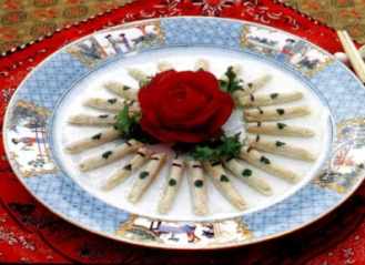 1、 选用文山玉指竹笋12根,用冷水漂洗一下,用餐刀将竹笋竖着一剖两开剔去笋心不用,将竹笋放到开水锅中滚透,再放到汤锅中放入清汤、鸡精、糖煨入味晾冷备用。香菜去梗选嫩叶洗净备用。