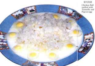 4、 另起鍋,放入清湯、鹽、黃酒、雞精勾薄芡淋入雞油,均勻地澆在銀耳和鴿蛋上即成。