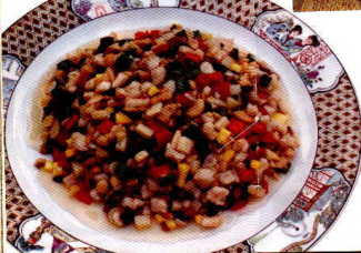 3、 将各种干果去皮用油炸酥脆。水发香菇、鲜蘑、豆腐干、红绿青椒切成小骰子丁状备用。