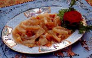 4、 起锅置火上,将锅烧热,放入少许底油(葱油)兑入清汤、盐、绍兴黄酒、鸡精烧开,即下鹿筋、鲜笋、鲍鱼,略煨以下,再放入干贝煨入味,即勾入水淀粉,淋入鸡油即成。
